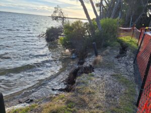 “Recent storms have worsened the erosion at Seagull Drive to the point it is now almost eating away at the boat ramp car park and the walking track along the foreshore is being moved again.